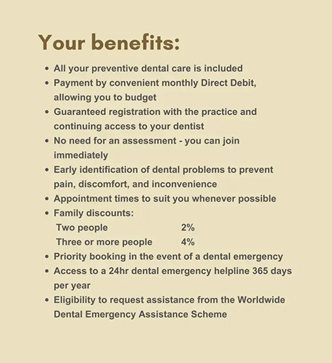 - membership card with 24-hour helpline numbers for dental emergencies at home or abroad